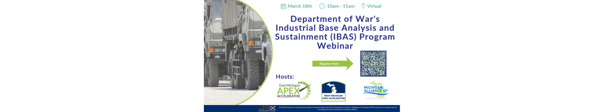 Please join East and West Michigan APEX Accelerators, in collaboration with the Michigan Alliance of APEX Accelerators for an IBAS webinar, featuring special guest Dr. Kristin Schaaf, Acting Director of Innovation Capability and Modernization.