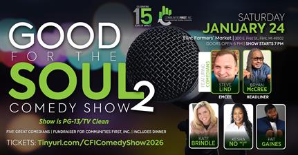 Back by popular demand, get ready for the return of Communities First, Inc.’s Good for the Soul Comedy Show 2, a hilarious night of stand-up comedy and a delicious dinner. Join us for a fun night of dinner, laughter, and community at the Flint Farmers’ Market on Saturday, Jan. 24, 2026. Doors open at 6:00 PM for dinner, and the show begins at 7:00 PM. A minimum $50 donation per person includes both dinner and the comedy show, with a cash bar available. This fundraiser supports Communities First, Inc.’s programs and services. Enjoy a TV-clean (PG-13) show featuring emcee Steve Lind, comedians Kesha No “I”, Pat Gaines, Kate Brindle, and headliner Bryan McCree. Space is limited, get tickets at tinyurl.com/CFIComedyShow2026